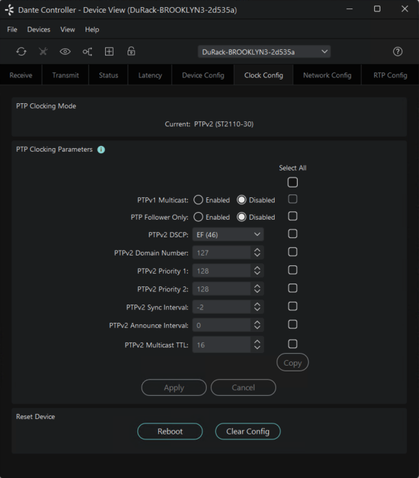 Use the Clock Config tab to set the PTPv2 clocking configuration for devices that support RTP (AES67 and ST 2110-30).