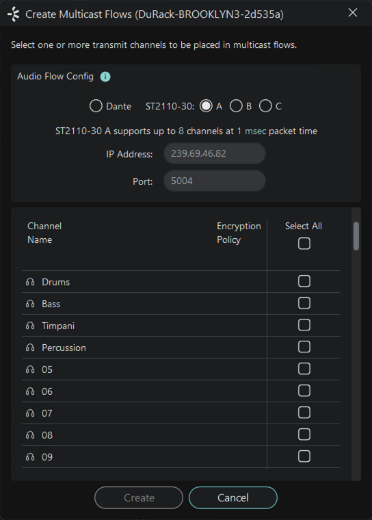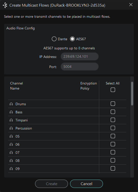 Select the channels you want to add to the transmit flow. If the number of selected channels exceeds the maximum number supported by the config, multiple flows will be created.