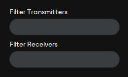 The device lists in the Routing view can be filtered using the 'Filter Transmitters' and 'Filter Receivers' boxes, below the Dante logo in the top left-hand corner. Any text string typed into the box will filter the view to only display devices that contain that text string, in either a device name, or channel name.