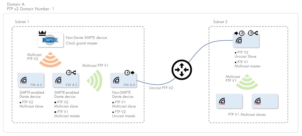 The diagram below illustrates an example of a routed multi-subnet domain with a mix of Dante firmware versions, and all device clocks synchronized to a non-Dante SMPTE device.