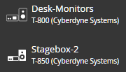 Legacy devices can be easily identified by their icon in the Devices page. In the image below, the 'Desk-Monitors' device is a legacy device, and the 'Stagebox-2' device is a non-legacy (firmware v4.x or above) device.