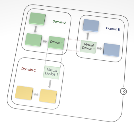 A virtual device is a 'projection' of a real device, which can appear in multiple domains simultaneously, and can be subscribed to by real devices in those domains. It presents in Dante Controller as an independent transmitter, but is really just a logical entity which acts as a subscription proxy for a real device.