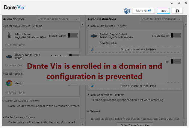 Depending on configuration settings made by the domain administrator in DDM, when Dante Via is enrolled its user interface may become locked: