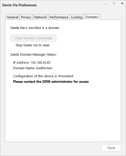 When Dante Via is enrolled in a Dante domain, it stores 'domain credentials' (enrollment information) for the relevant DDM server and domain, and the user interface may be locked (depending on the controller permissions configured in Dante Domain Manager). When Dante Via is unenrolled, it returns to the unmanaged domain, the domain credentials are automatically cleared and the user interface is unlocked.