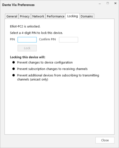 You can lock and unlock Dante Via locally using the UI, or remotely using Dante Controller.