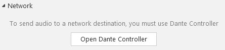 To launch Dante Controller from the Dante Via user interface, click the ‘Open Dante Controller’ button in the Network section.